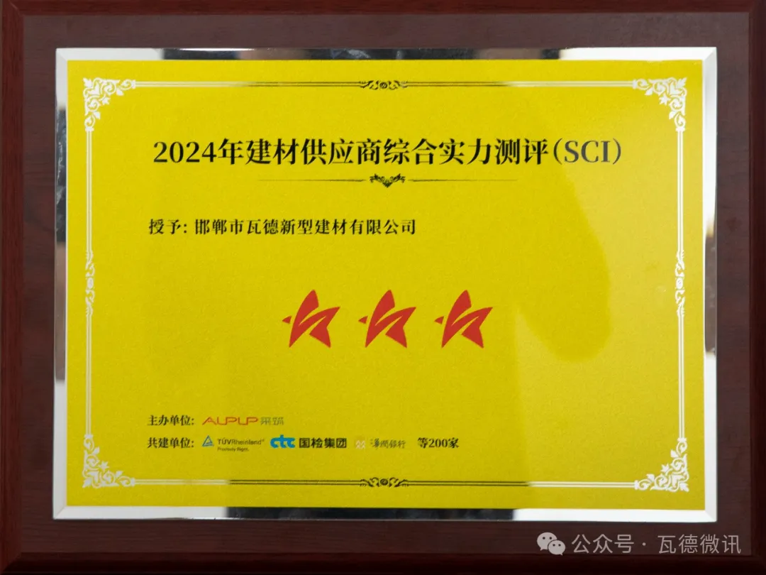 2024年4月8日,“5光同行 聚星閃爍”采筑聯合者大會在重慶順利召開,現場重磅發(fā)布2024年供應商綜合指數SCI測評結果,獲全場數百位政府單位、采購商、供應商、行業(yè)協會、領域專家等點贊認可。 瓦德新材在本次SCI綜合測評中獲評“三星供應商”。本次SCI測評共有2600余家參評單位,其中僅197家